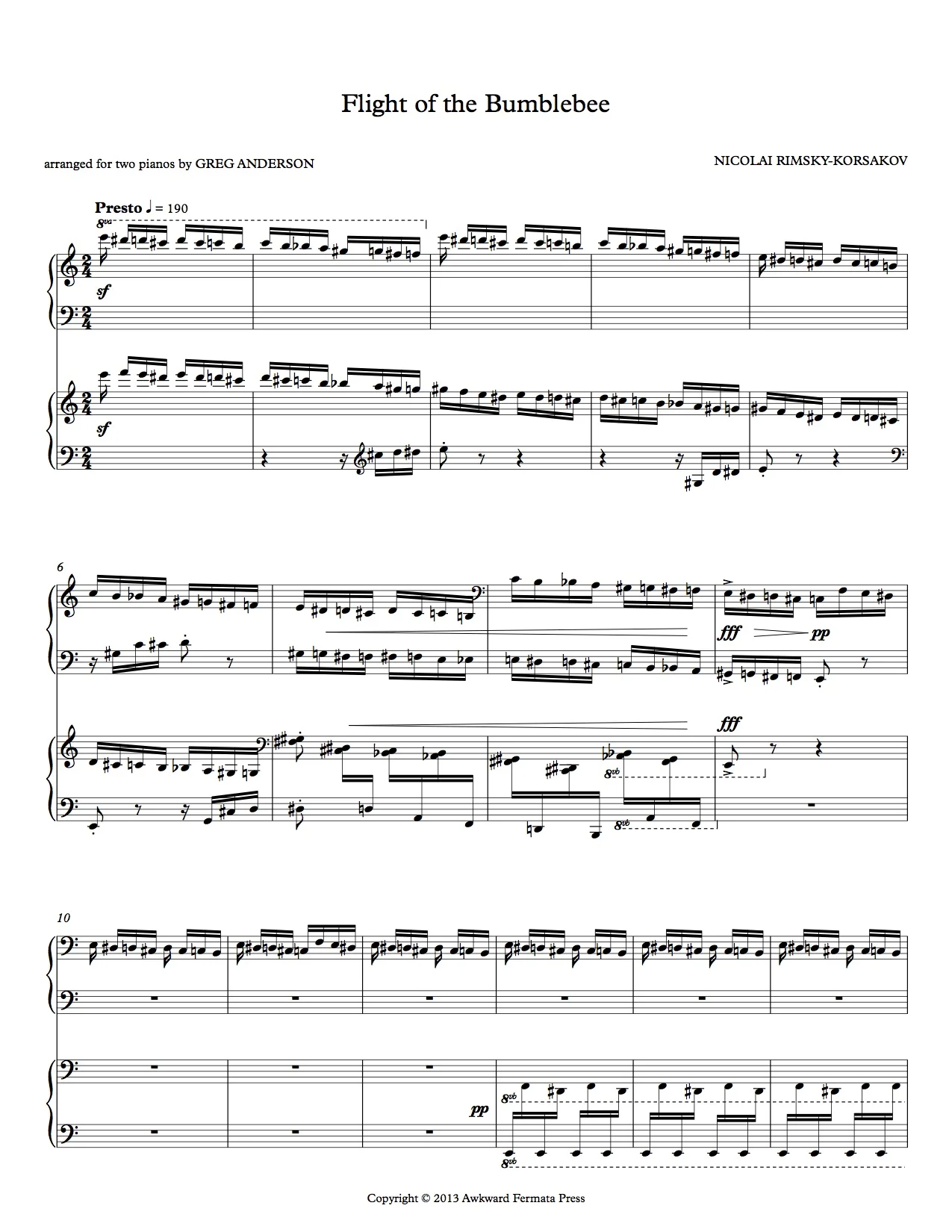 Endowed with new powers as a bumblebee, Gvidon causes a great deal of chaos in his frantic quest for his father and personal redemption; this commotion can be heard in the piece's rapid, dizzying whirl of chromatic passages. Yet, despite its operatic origins, the "Flight of the Bumblebee" has become universally renowned as a stand-alone instrumental showpiece. In our transcription for two pianos, we take advantage of our twenty fingers to imitate the sound of not just one bumblebee, but an entire swarm of bumblebees. The result buzzes with extra velocity and virtuosity.